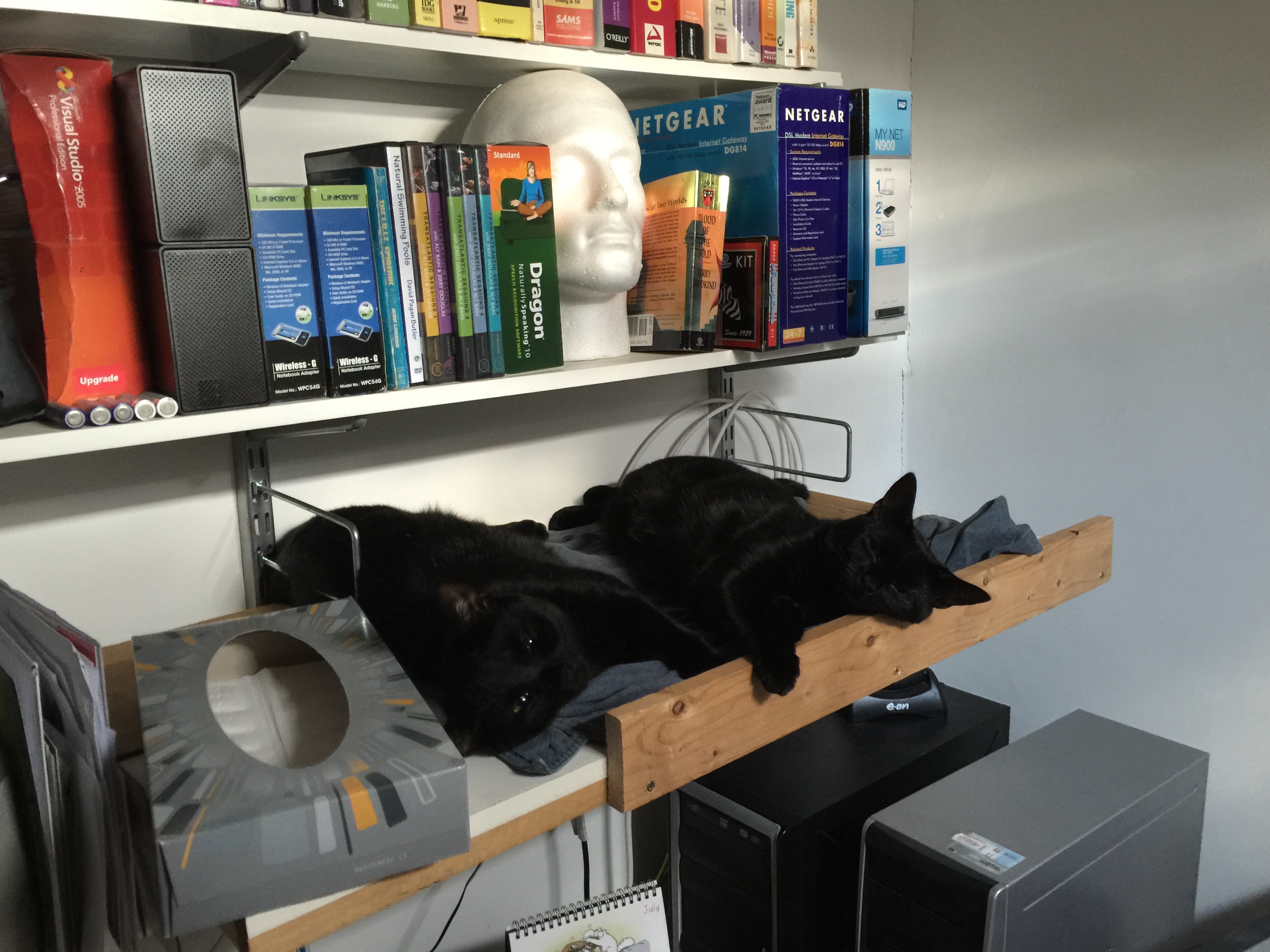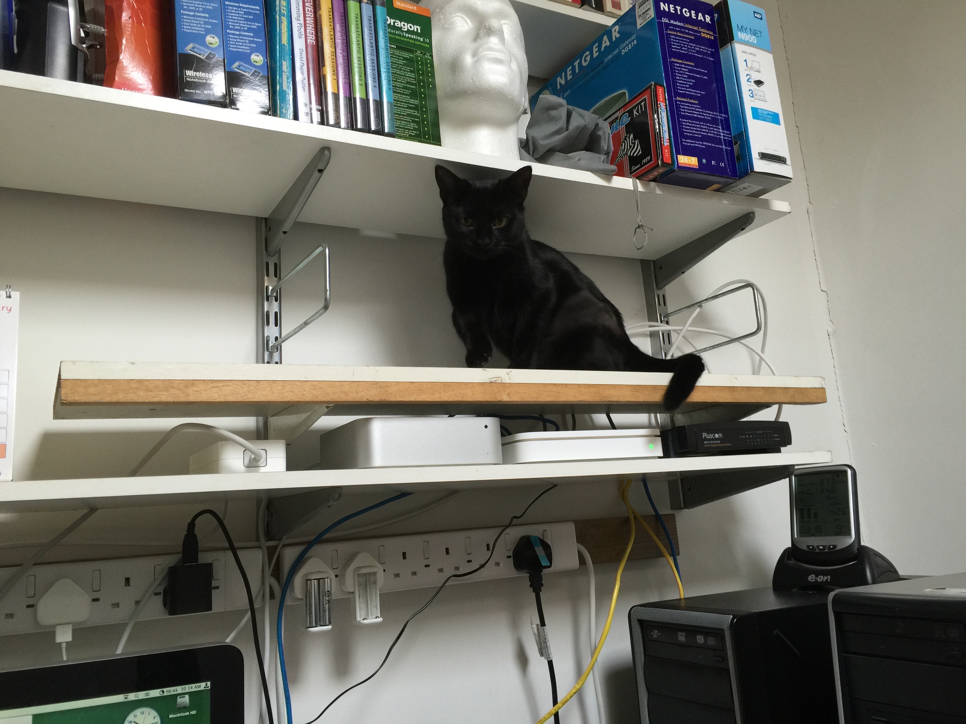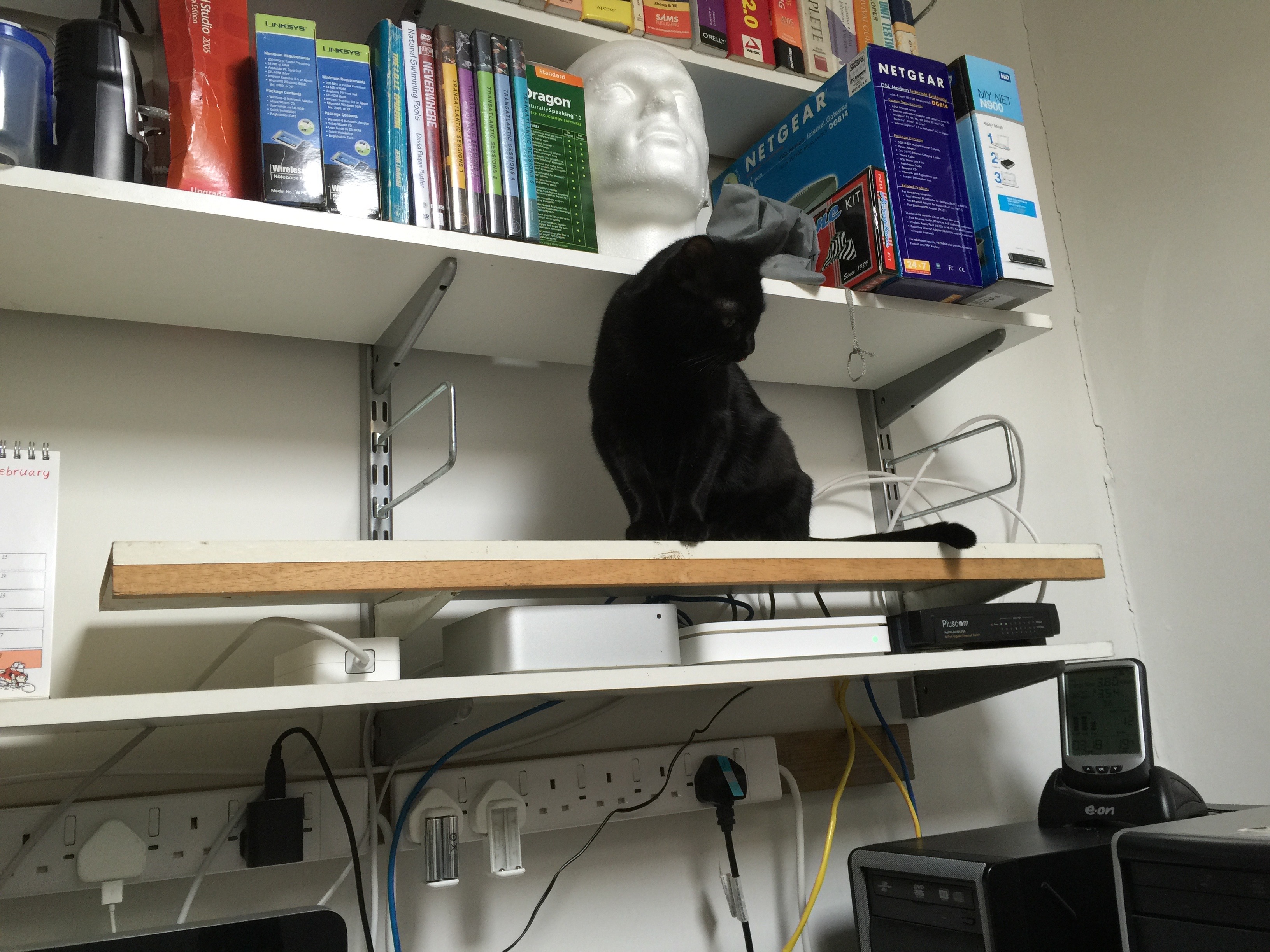 So, I’ve put in a mezzanine shelf to prevent the cat from being able to get on to the equipment. It’s proving to be a bit awkward when I want to add another cable to the hub but at least they are now protected from sleeping cats.