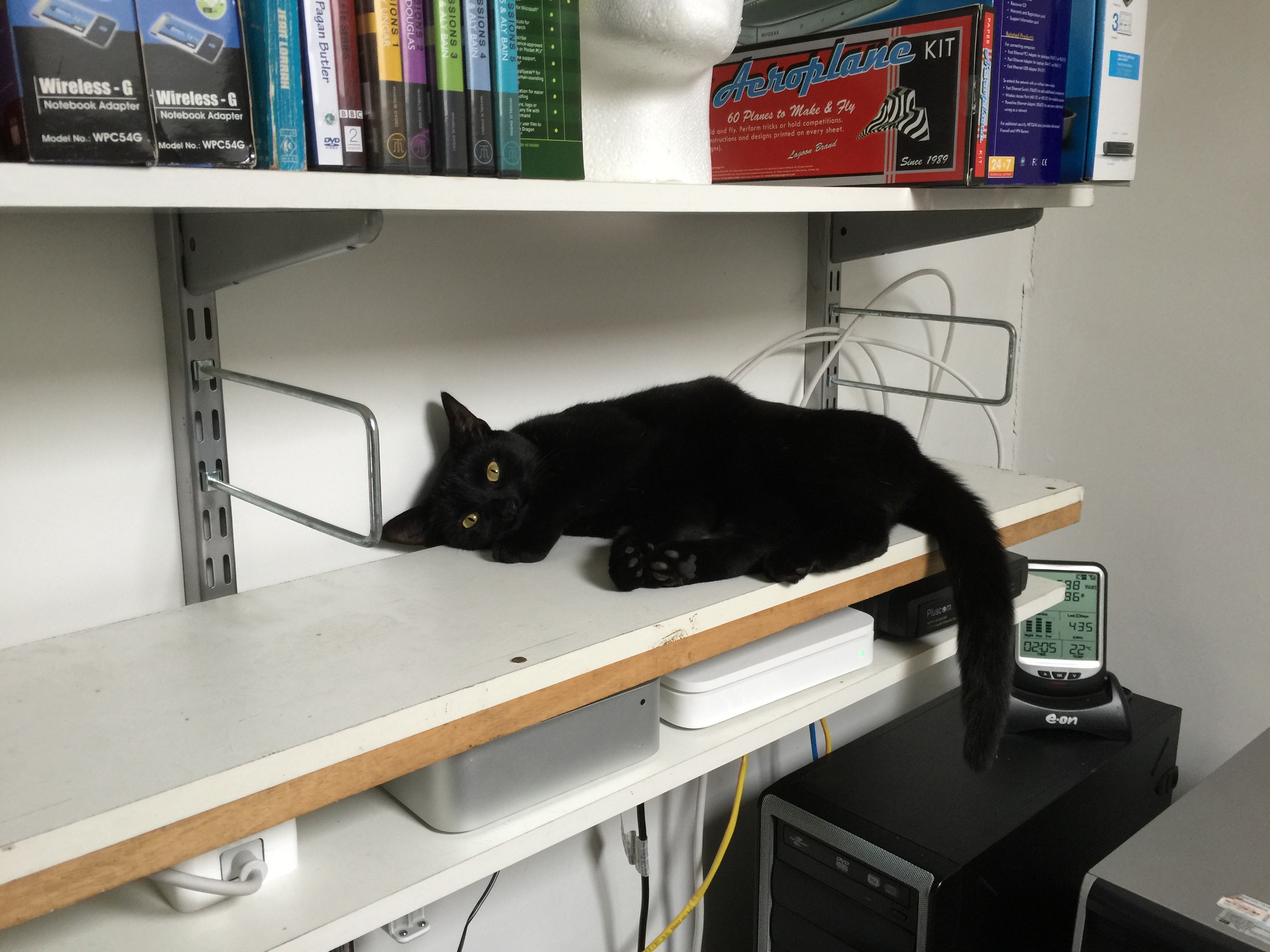 One of my cats has taken to trying to curl up on my Apple Time Capsule which I keep on one of the shelves in my home office. Unfortunately there are two things wrong with this. Firstly the cat is bigger that the unit and secondly, when the cat sprawls over the unit, the Mac Mini and Hub that are either side of it, she can and does lie on the network cables. Occasionally she manages to move one of these cables enough to disrupt the connection. Most of the time this isn’t a problem but if she does this when a back up is taking place, the back up fails. There is also the case when she stretches. The three bits of hardware on the shelf get pushed further and further towards the edge of the shelf and I have to keep pushing them back on before one of them falls off.