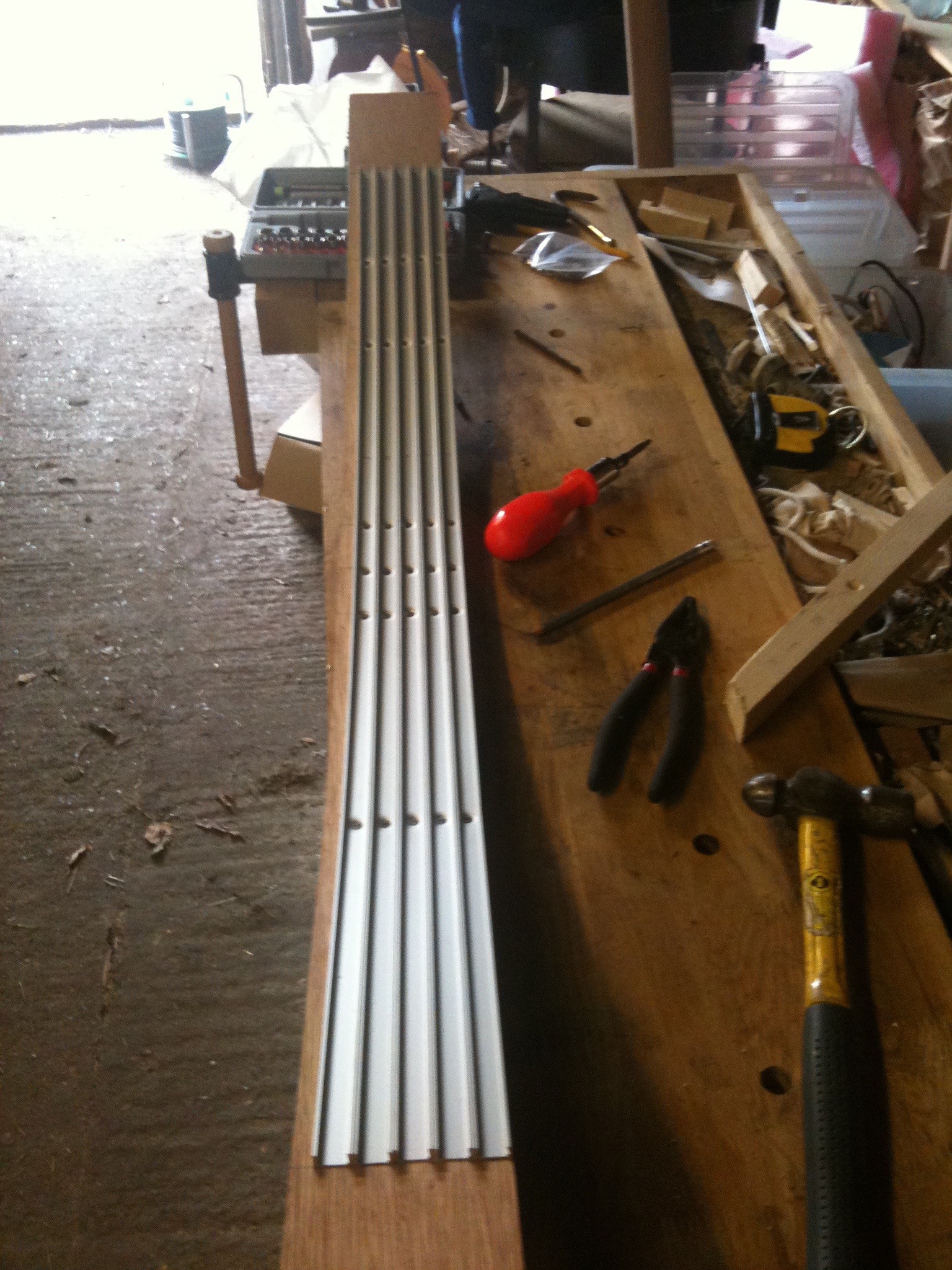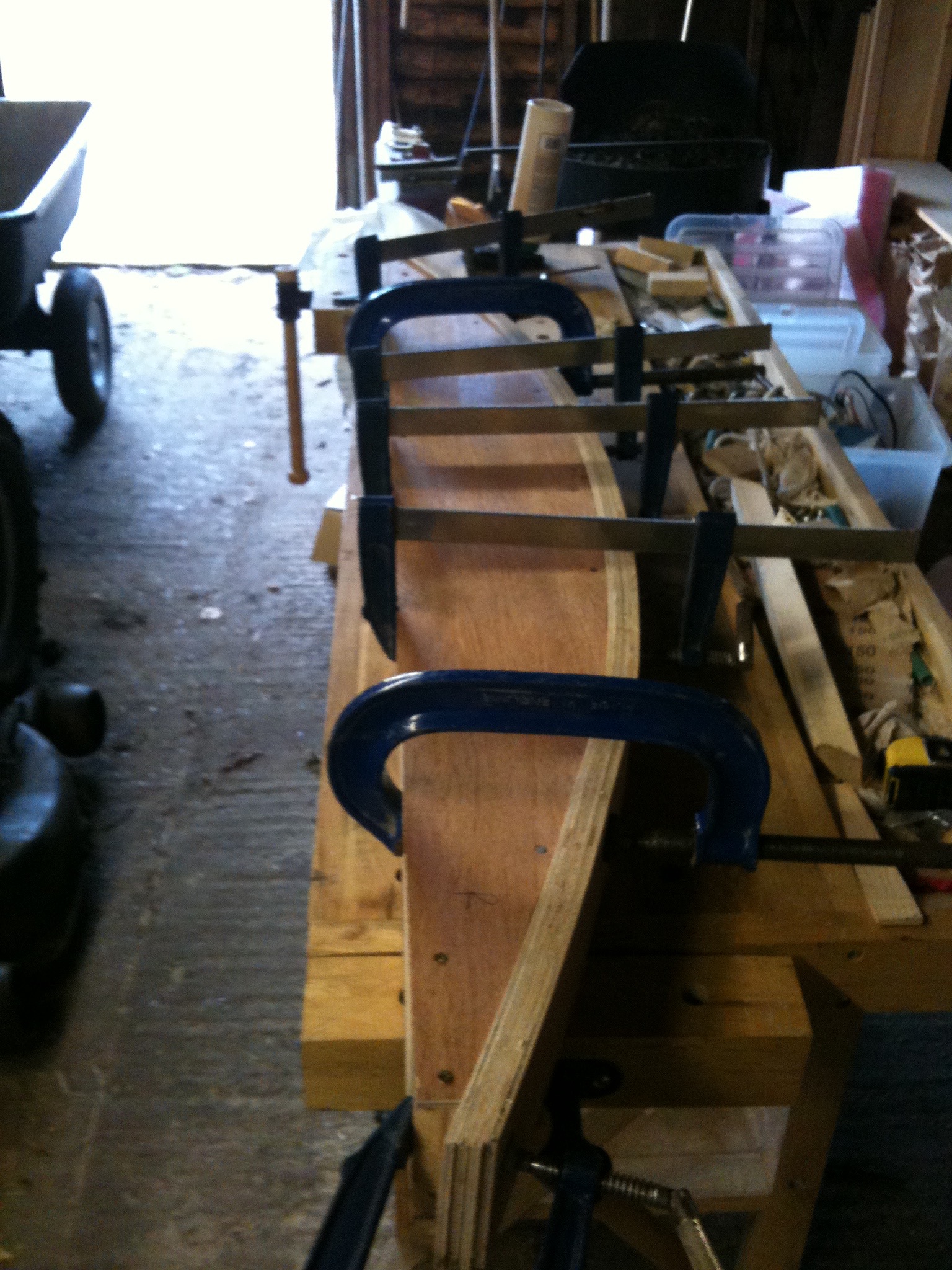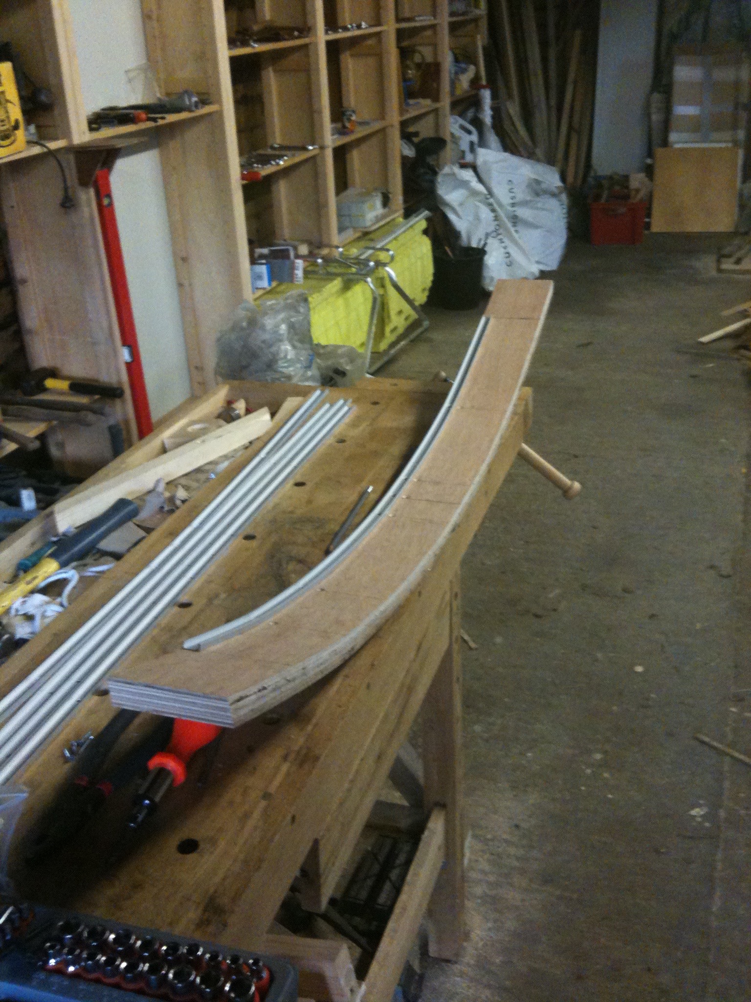 Looking at the arch in detail I realised that a form was needed that would be fixed to the brickwork and allow the aluminium channel to be mounted on the underside. A laminating jig was soon knocked up and I used this to laminate 4 layers of 4mm plywood to give me the former.