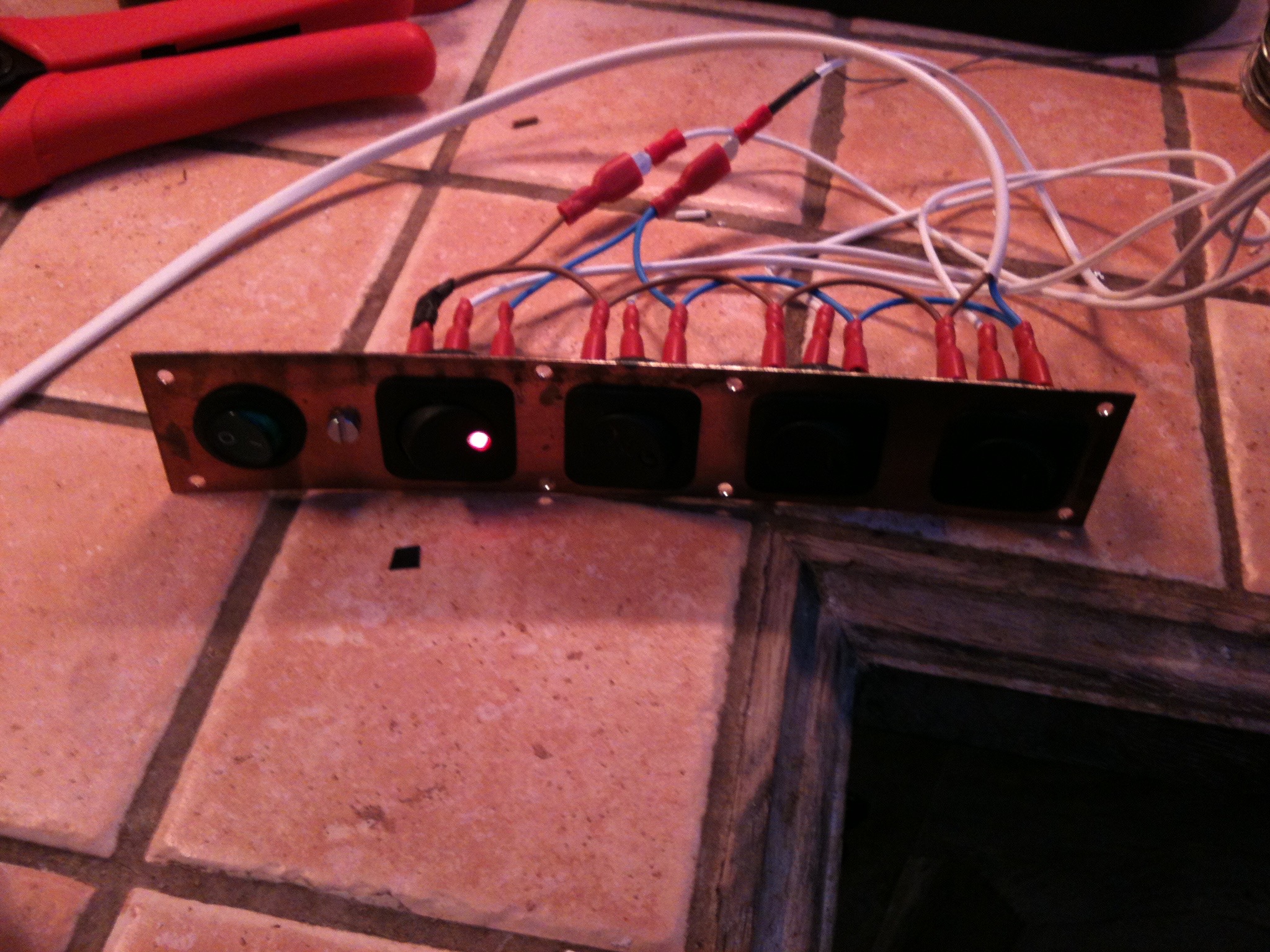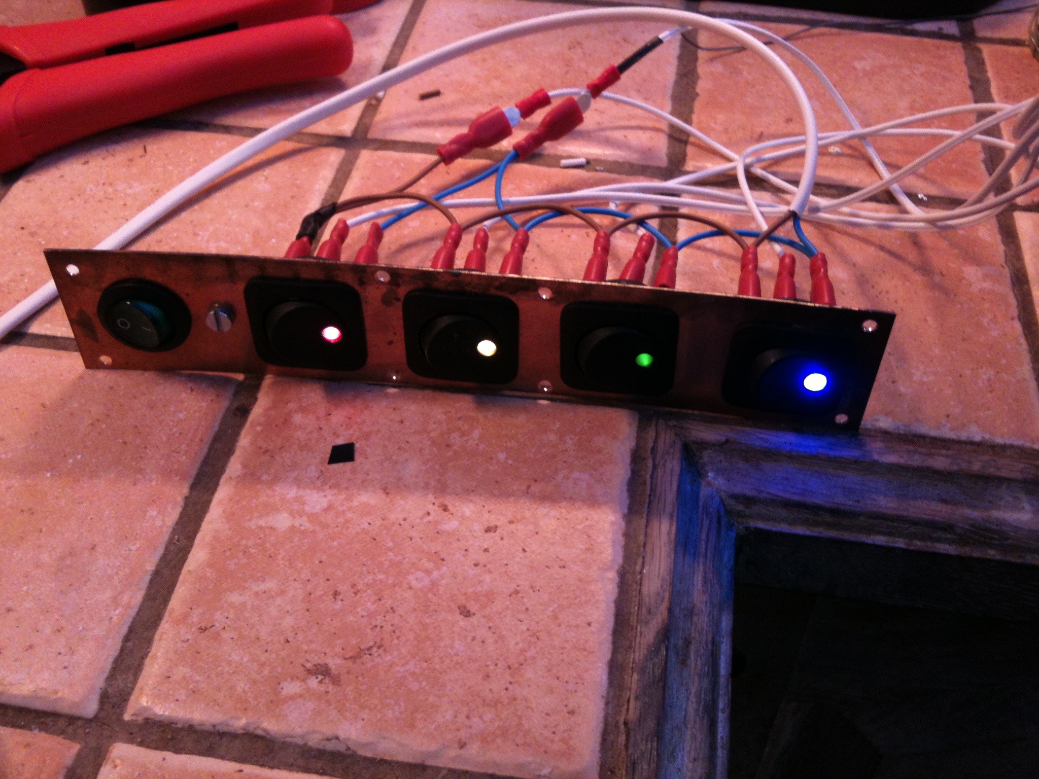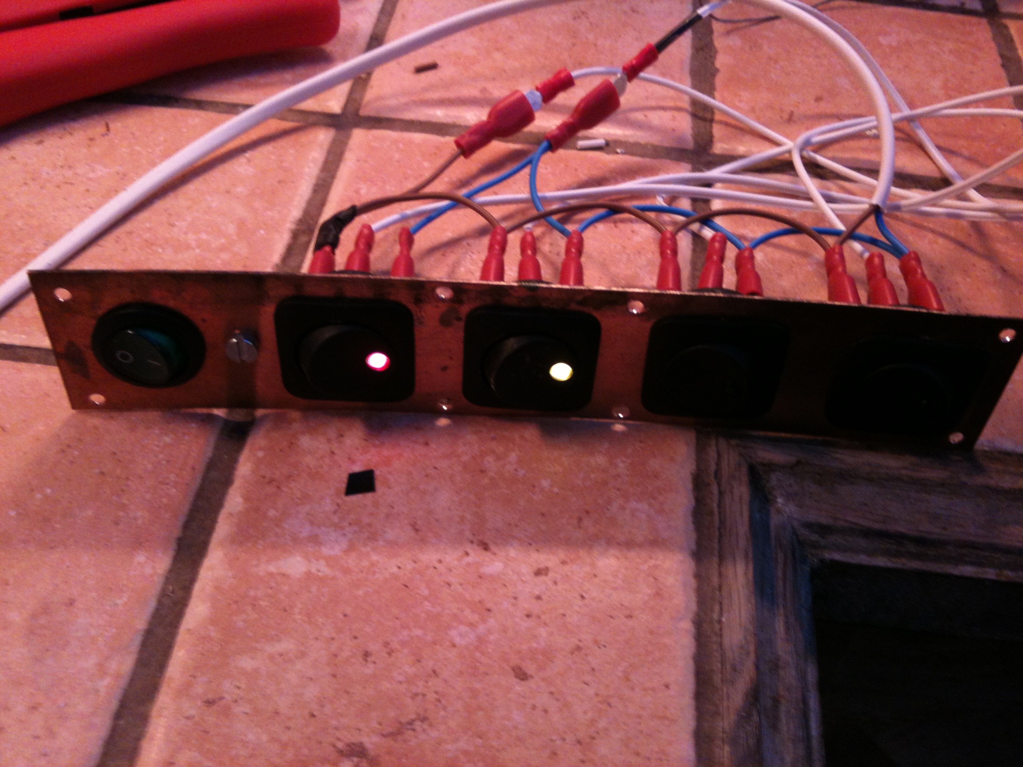 The five switches were mounted on a thin copper sheet with the 240v switch at the top. The intention was that turning on the power to the transformer with the 240v switch would illuminate one strip. The other four 12v switches would be used to turn on the other four strips. as you can see below.