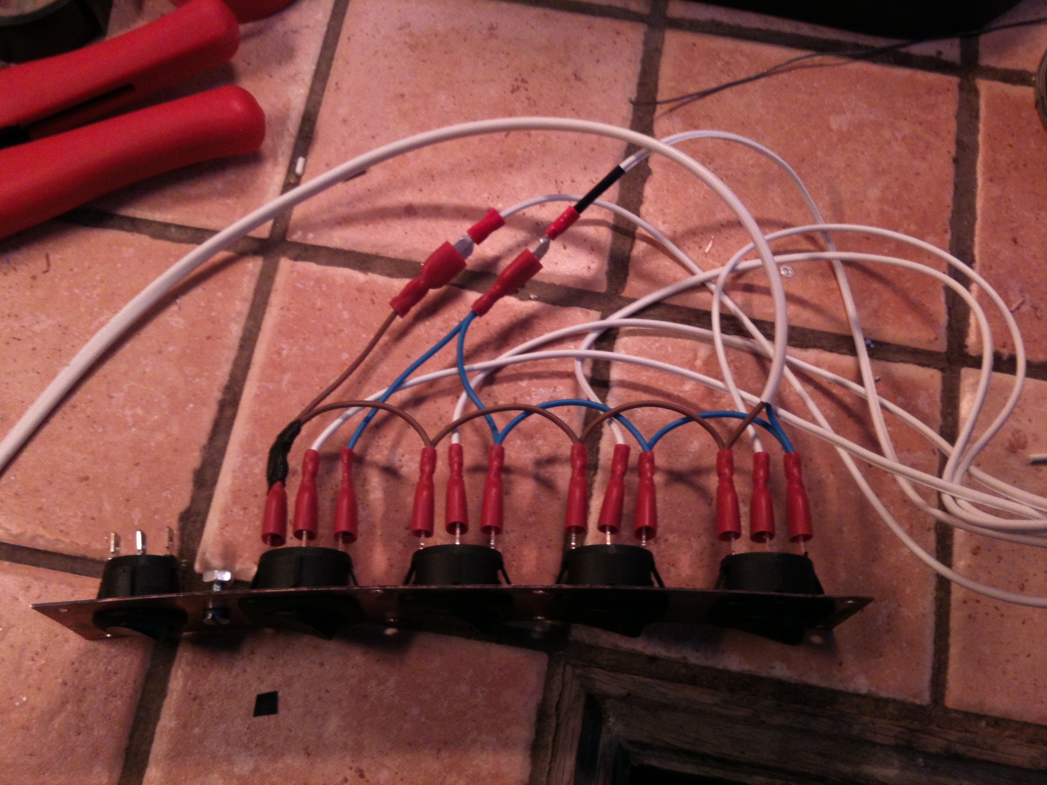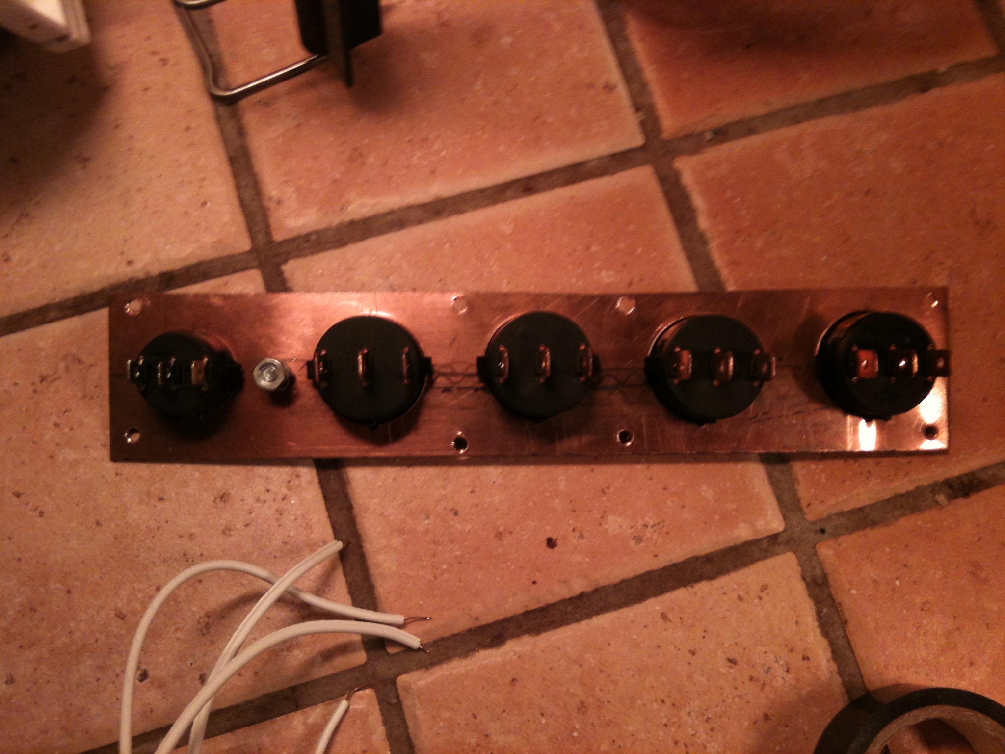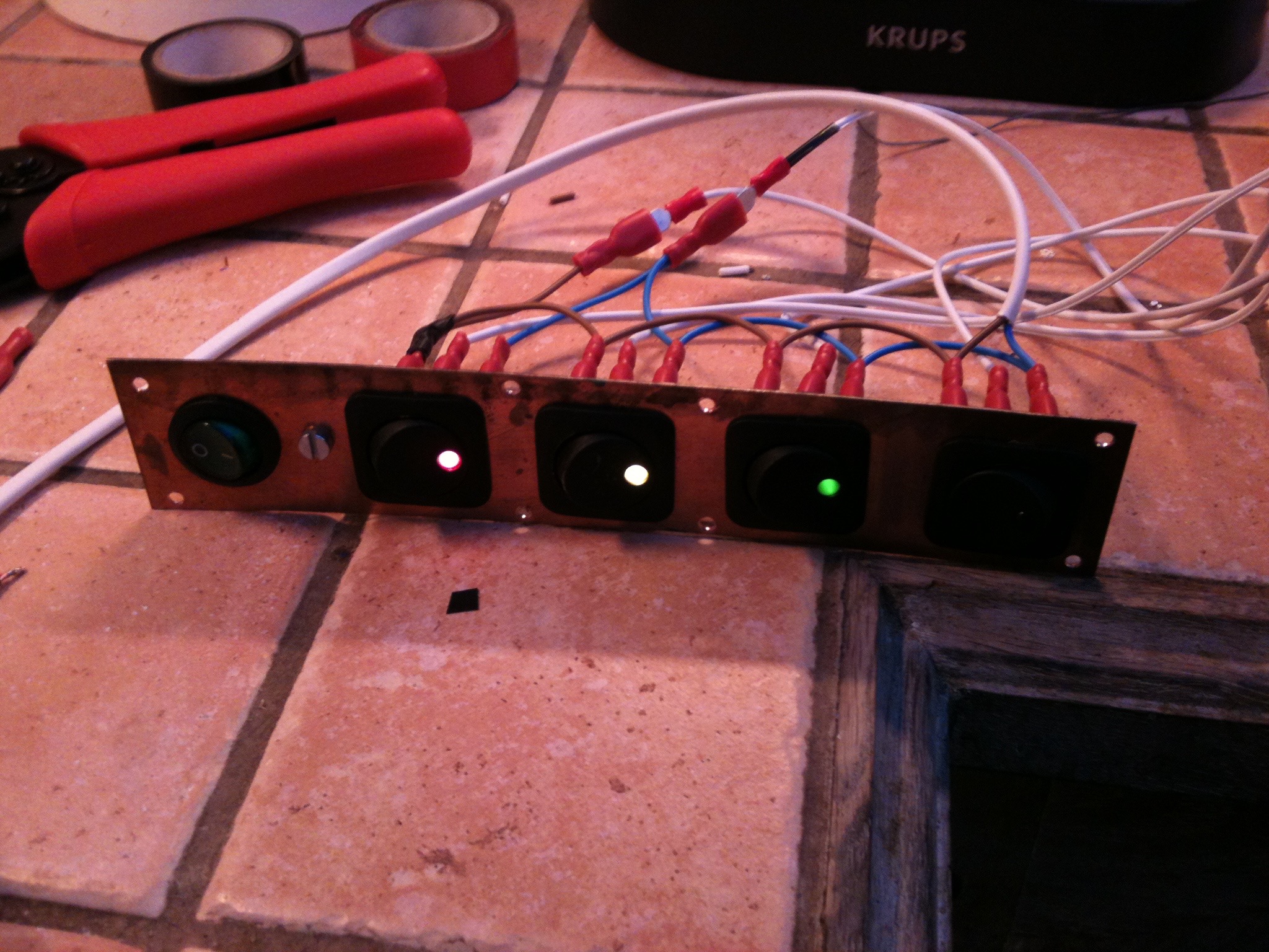 The five switches were mounted on a thin copper sheet with the 240v switch at the top. The intention was that turning on the power to the transformer with the 240v switch would illuminate one strip. The other four 12v switches would be used to turn on the other four strips. as you can see below.